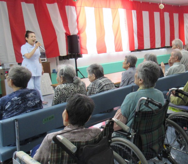 敬老の日を前に、敬老祝賀会を開催しました。今年はコロナの影響でボランティアさんの参加が見送られ、職員による各種アトラクションに趣向を凝らしました。手作り紙芝居や二人羽織、コーラスグループ所属の職員による独唱、ジェスチャーゲーム等々。皆さんから大きな拍手を浴び、『ブラボー』とか『大統領』とか掛け声もかかり、素敵な祝賀会になりました。お祝い膳もお赤飯、天ぷら盛り合わせ、青菜のお浸し、高野豆腐のお煮しめ、あさりの赤出汁、今が旬のいちじくと皆さんからとても好評でした。
