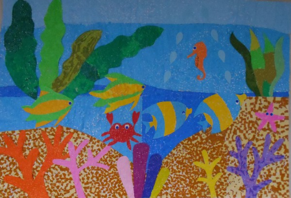 繋ぎ合わせて大きな壁画を作成します。作成中はこれは何になるのかな、と皆さん思案されながら、それでも大作ができあがると壁一面に涼し気な海の中が現れ、大きな笑顔がこぼれます。