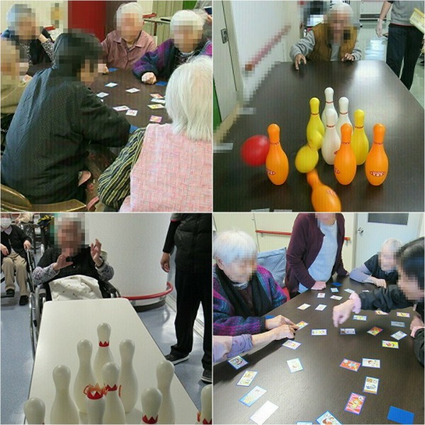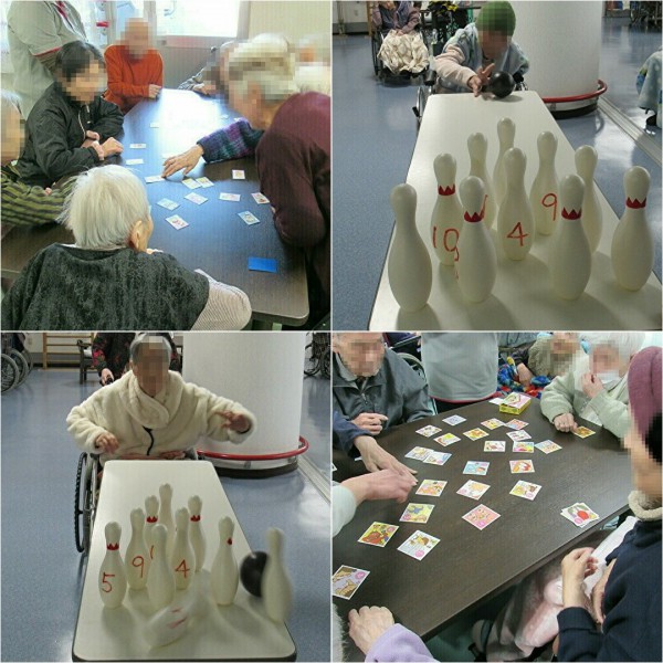 皆さんでお正月の記念撮影、お節料理に舌鼓、カルタ取りやボウリングゲームに興じ、