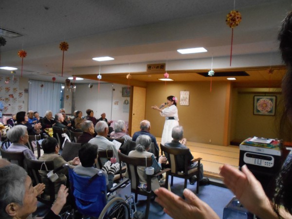 なごみ会の皆さんが踊りや歌の披露にいらしてくださいました。『待ってました』『覚えてるでぇ』との声もとぶ中、華麗な踊りに、素敵な歌声に酔いしれたひとときでした。