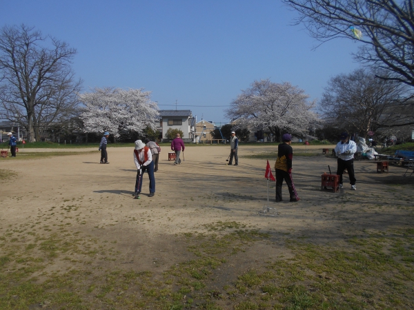 安倍史跡公園でのグラウンドゴルフの様子です。毎週月・水・金と3回/週活動されています。登録メンバーは30名程。4~5名のグループでコースを回ります。15、20、25、30、50mのコースがあり、皆さん力強くクラブを振っておられる。参加されている80代の方は雨が降らない限り参加されていて「若い時はスポーツが好きで陸上部だった。年を取ってなかなか運動ができなかったが、今はグラウンドゴルフに参加して楽しんでいる」といきいきと話されている。ゆっくりだが、たくさんのコースがあり、自然と歩くことができて、いい運動になるとのこと。「今の季節は桜が咲いて景色が良く気持ちがいいのよ」とお花見をしながらプレーをされている。終了後は皆さんで手分けして、片づけをされ、ティータイムを楽しまれる方もいらっしゃいました。次回3月30日はコンペがあり、コンペ終了後お弁当を食べながらお花見をされるそうです。コンペは景品が用意してあるとのことで皆さん楽しみにしておられました。