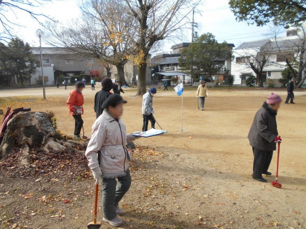 地域住民も通いの場としてのグラウンドゴルフの会場に取材の為訪問しました。毎週火・木の9時~11時、3ラウンドを10分の休憩を交えながら行っています、とのこと。昭和公園のある桜井校区の参加者の方が殆どで、年齢は65歳から86歳までの方々が仲良く熱心に和気あいあいとやっています、とのことでした。皆さん声を掛け合いながら、一生懸命プレーしておられました。