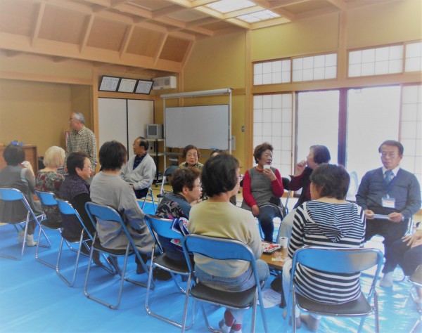 赤尾のいきいき百歳体操の様子です。毎週当番を決めて、会場の準備等されています。会場の畳が傷まないようブルーシートを敷いて椅子を並べられています。今年度から桜井中学校区の福祉相談員さんが代わられ、地域の様子を知る為、とのことで参加されていました。体操終了後は、皆さんでテーブルを囲んで茶話会を愉しまれていました。本日の参加者は地区の福祉相談員さんを含め16名の参加でした。