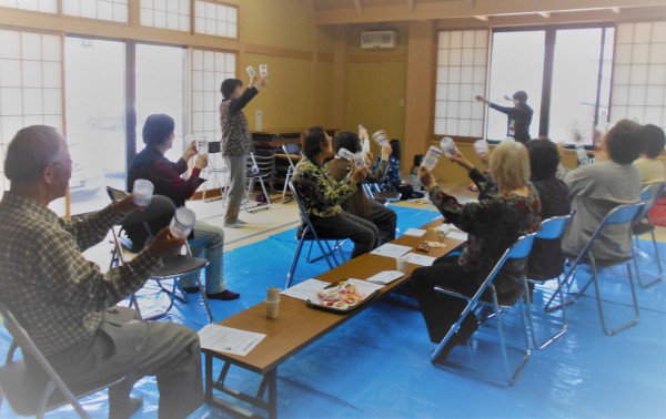赤尾いきいき百歳体操終了後、この会場では、引き続いてミニ集いの広場を開催されています。今日は未就園児4名と保護者3名が参加されました。桜井市役所健康増進課の職員さんが手遊び歌や手作りのマラカスを皆さんと一緒にされたり、何度か参加されている未就園児の名前を参加されてみえる方が憶えていらして名前を呼んで共にふれあいを愉しまれました。皆さん笑顔で参加され、とても和やかな雰囲気の集いの場になっているように思いました。