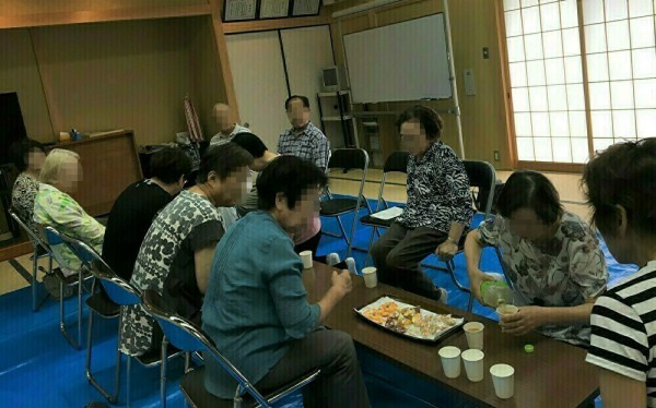 いきいき百歳体操赤尾の会場です。畳が傷まないように、ブルーシートを敷いて椅子を並べてみえます。また、毎週当番を決めて、会場の準備やDⅤDの再生などをされています。体操終了後は皆さんでテーブルを囲んで茶話会を愉しまれています。近所のスーパーの営業時間が変わることや、近所の幼稚園が閉園になること等、皆さんで情報交換されていました。本日の参加者は13名(男性2名、女性11名)でした。