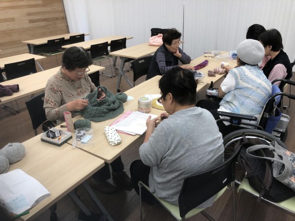 大和信用金庫別館で開催されている手芸教室の様子です。第1・3水曜日は、大和信用金庫別館で、第4水曜日はエルト2階で活動されています。皆さん毛糸でマフラーとマットを作っておられました。難しい部分は講師役の方から教えてもらい、できるところは会話を楽しみながら、編み物に勤しんでおられました。最近参加された方も、すっかり皆さんと仲良くされ『楽しいです。紹介していただいて本当によかった』とおっしゃってみえました。本日の参加者は8名でした。