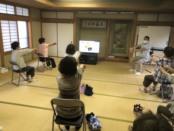 いきいき百歳体操文殊が丘の会場です。毎週月曜日文殊が丘集会所で活動されています。本日は桜井市の通いの場への専門職派遣事業の一環で、理学療法士さんによる体操の指導の日でした。会場はエアコンをいれていますが、感染症の影響で窓を開けて、空気の入れ替えをしながら、体操されていました。コロナ禍でも、自宅でできる体操の紹介として『いきいき健康長寿体操』のパンフレットをお渡しされ、体操内容を皆さんで確認されていました。