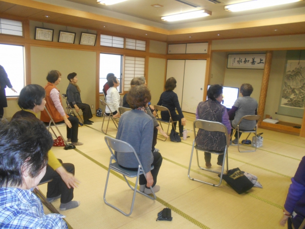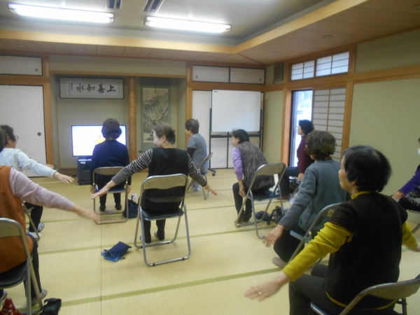 いきいき百歳体操、文殊が丘の会場です。今日は3か月に一度の体力測定の日です。わきあいあいと和やかな会場です。
