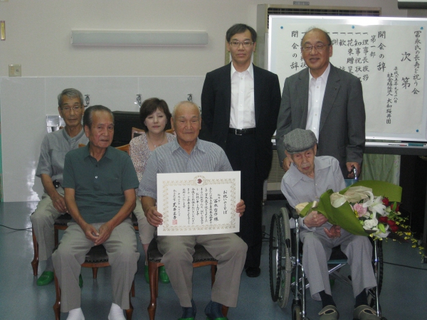 当施設に入居されている冨永様が、奈良県内男性最高齢者として荒井正吾奈良県知事の訪問を受けました。冨永様は109歳、祝状と記念品をいただきました。
