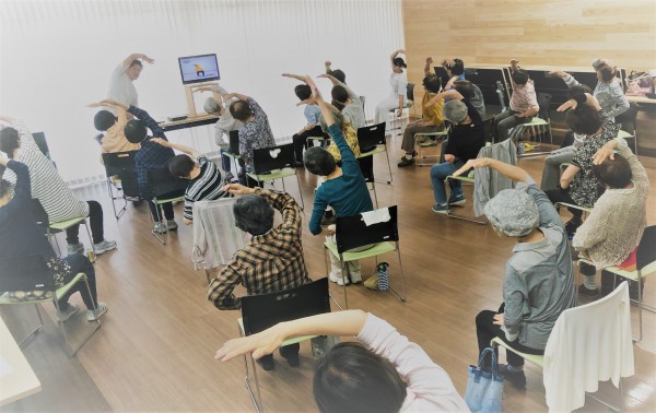いきいき百歳体操~桜会~の様子です。大和信用金庫別館で毎週月曜日に開催されており、桜井中学校区内のいきいき百歳体操の会場では一番登録されている参加者の多い会場でもあります。今日は桜井市の事業でリハビリ専門職派遣の日です。いつもと同じいきいき百歳体操ですが、やはり専門職からの指導日は空気がいつもよりひきしまる感じがあります。体操のポイントポイントをわかりやすく説明されるのですが、参加者が多く、後方の席の方は前方のリハビリ専門職の方が見えずらい様子で、椅子から立ち上がって指導方法を確認しながら体操されていらっしゃいました。本日の参加者は35名でした。