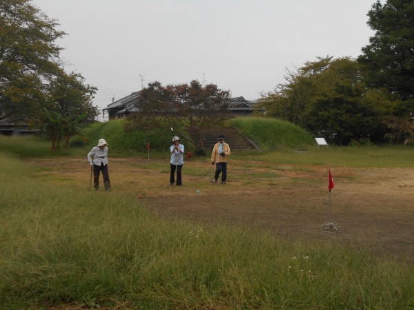 安倍史跡公園でのグラウンドゴルフの様子です。毎週月・水・金 9時~11時頃まで活動されています。雨が降ったり止んだりの曇り空でしたが、皆様お元気にプレーを愉しまれていました。『今日は〇〇さんが一番調子いい』と皆さんお話しされていました。本日の参加者は18名(男性8名、女性10名)でした。